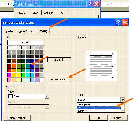 Then click the Shading tab. From that window, select CELL under the "Apply To" selections. Go to the "Fill" options and click on the blue you see selected on the right. As you create your own table, notice the "More Colors" selection. That will give you a much greater choice of colors for your cells. If you chose to "Apply to" the table, the whole table would change to the color you selected. |